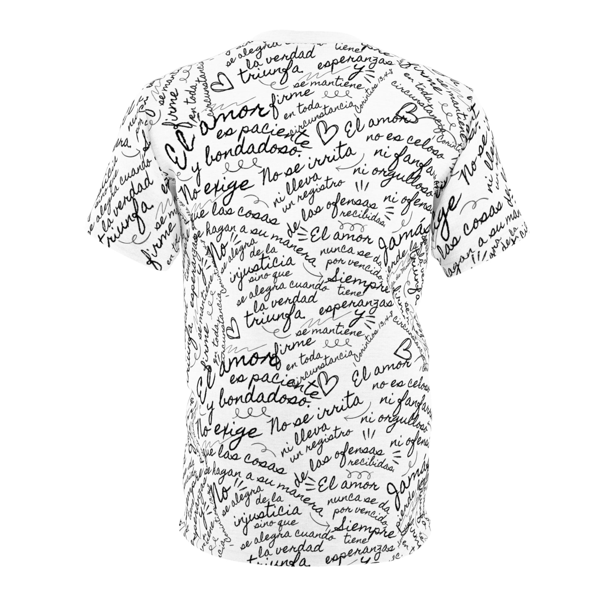 This AOP tee carries 1 Corintios 13:4-7 in Spanish across the whole garment, letting your faith move with you. The textured verse pattern reads like scripture woven into cloth, a subtle proclamation for Bible studies, church meetups, or quiet moments of reflection. It feels sturdy yet breathable — a mid-weight knit that holds its shape and wears in comfortably. The cut & sew construction and ribbed collar keep the silhouette neat, while tagless finishing and shoulder tape mean day-long comfort without distraction. Wear it to lead a discussion, sit in a prayer circle, or simply walk your neighborhood carrying a gentle reminder about patience, kindness, and faithful love.