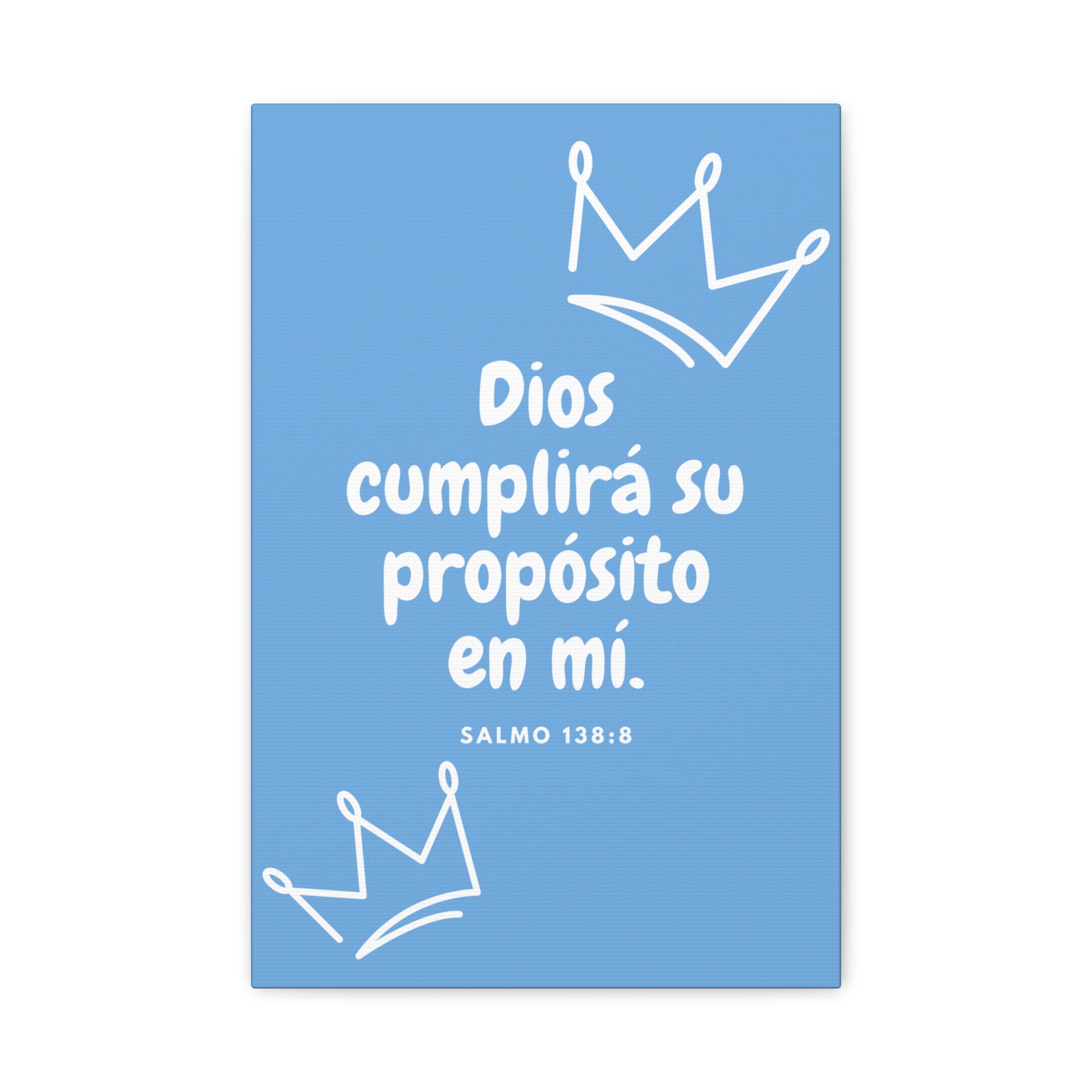 Place a hopeful truth on the wall where little eyes can see it every morning. This stretched matte canvas carries Salmo 138:8 — “Dios cumplirá su propósito en mi” — in a joyful blue layout that feels like a quiet promise. The soft, calming palette and hand-lettered feel create a gentle focal point for a nursery, bedroom, or playroom. Hang it above a crib, beside a bookshelf, or near a prayer corner to remind a child they are chosen and seen. The sturdy stretcher frame and fade-resistant finish mean the message stays vibrant through playtime, naps, and family prayers. It’s made to sit naturally in homes that center faith: a subtle, everyday way to plant God’s promises into a child’s room and the rhythms of family life.