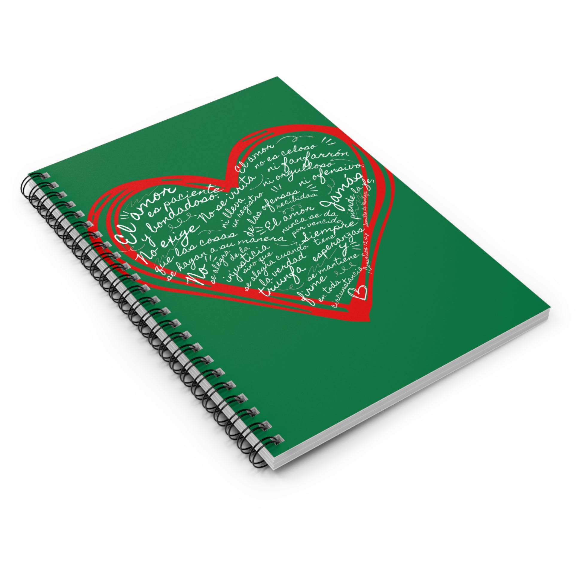 This 6" x 8" spiral notebook is a small, vibrant companion for anyone walking a faith-filled path. The bright green cover, hand-drawn red heart, and flowing white script of 1 Corinthians 13:4-7 invite moments of quiet reflection. Inside, 118 ruled pages on smooth 90 gsm paper make room for prayers, sermon notes, gratitude lists, or Bible study insights. A sturdy 350 gsm printed front cover protects your words while a dark grey back cover and metal spiral keep the book looking neat and easy to flip through. An interior document pocket holds loose verses, prayer lists, or church handouts. Carry it to Bible study, tuck it in a tote, or set it by your bedside — it’s built to be used, treasured, and returned to again and again.