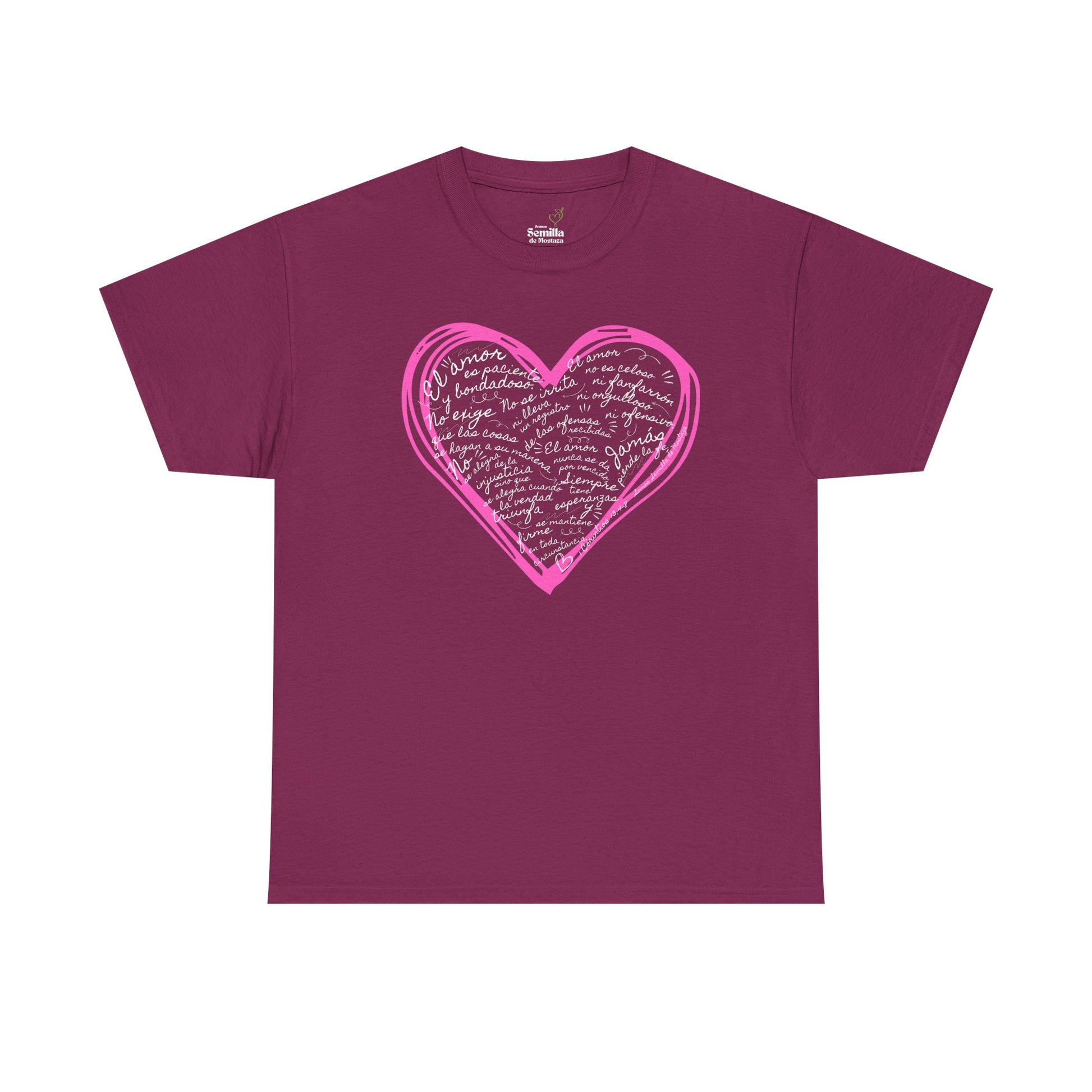 Soft, simple, and quietly devotional — this cotton tee carries a hand-drawn heart and the gentle Spanish lines of 1 Corintios 13:4-7 as a wearable reminder that love is patient and kind. The shirt settles into slow Sunday mornings, school pick-up, and small, intentional conversations over coffee. It breathes with you all day long, keeping its shape and the artwork crisp so your message remains steady without saying a word. Lightweight yet durable, it becomes an everyday layer that feels familiar the moment you pull it on.