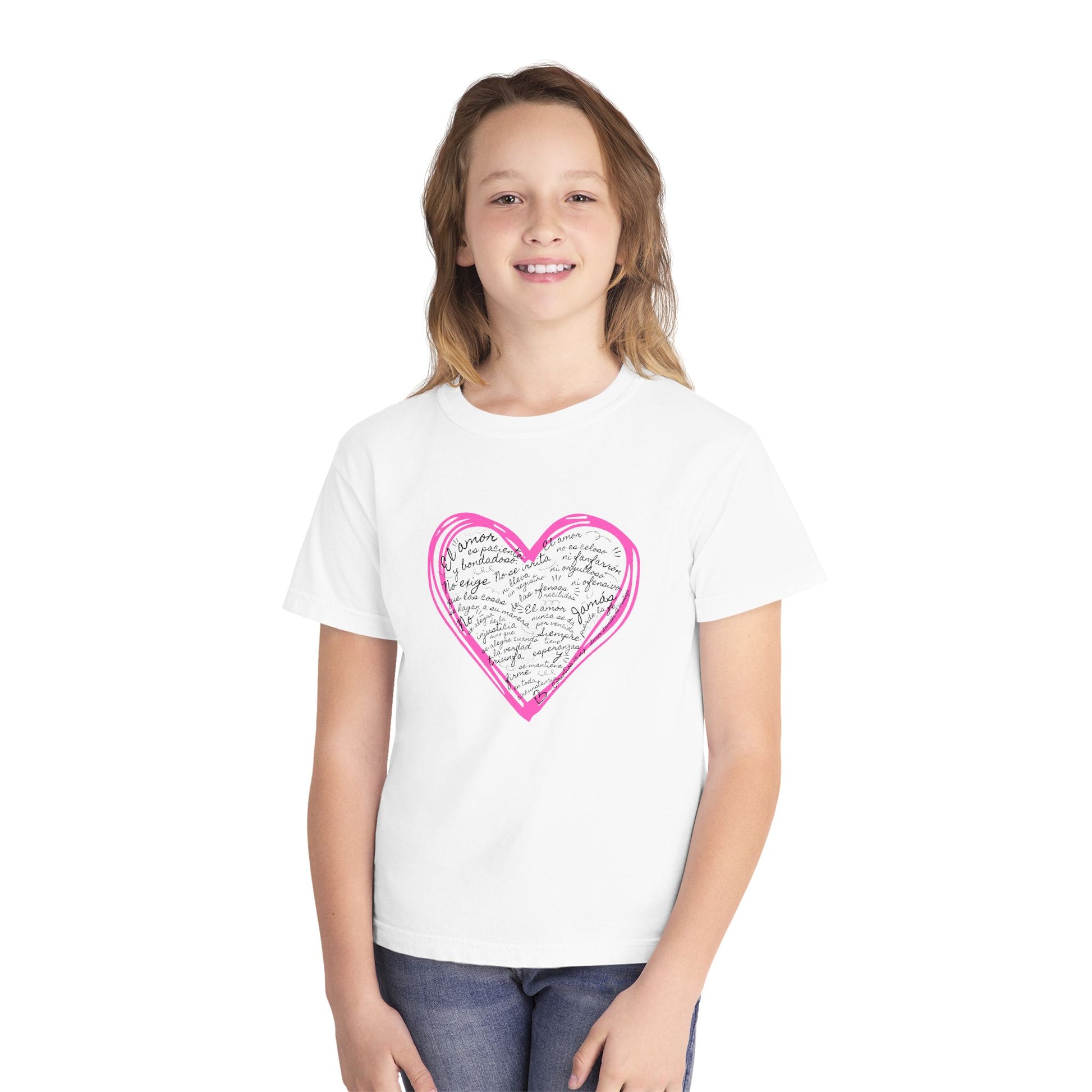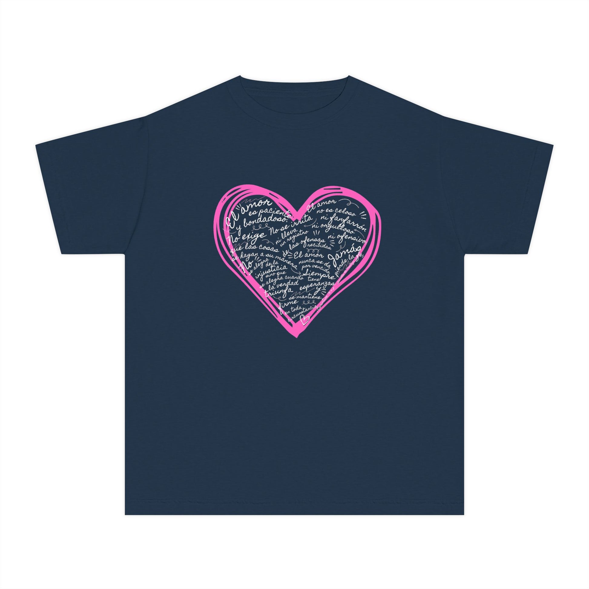 A gentle, faith-filled tee made to teach and comfort. This midweight youth shirt carries 1 Corinthians 13:4-7 in a heart-shaped design so the words of love travel with your child — to Sunday school, youth group, or the playground. The garment-dyed cotton feels broken-in and soft from the first wear, and the reinforced seams and neck tape help it hold up to active days. It’s a simple, hopeful piece that speaks scripture through style: subtle, sincere, and ready for everyday ministry through small, loving actions.